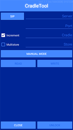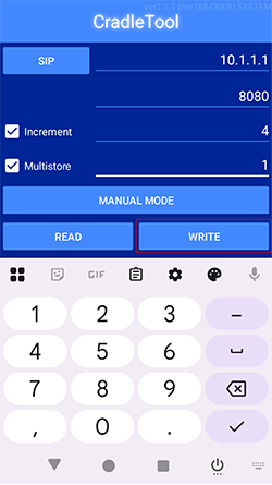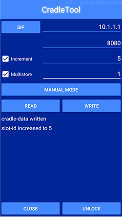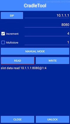 To verify the settings, toggle to MANUAL MODE, check Multistore if necessary, insert the device in the slot, and tap READ. A confirmation message will appear.